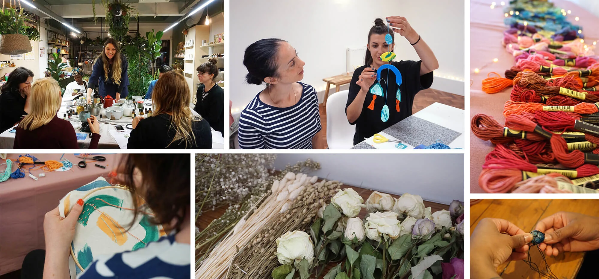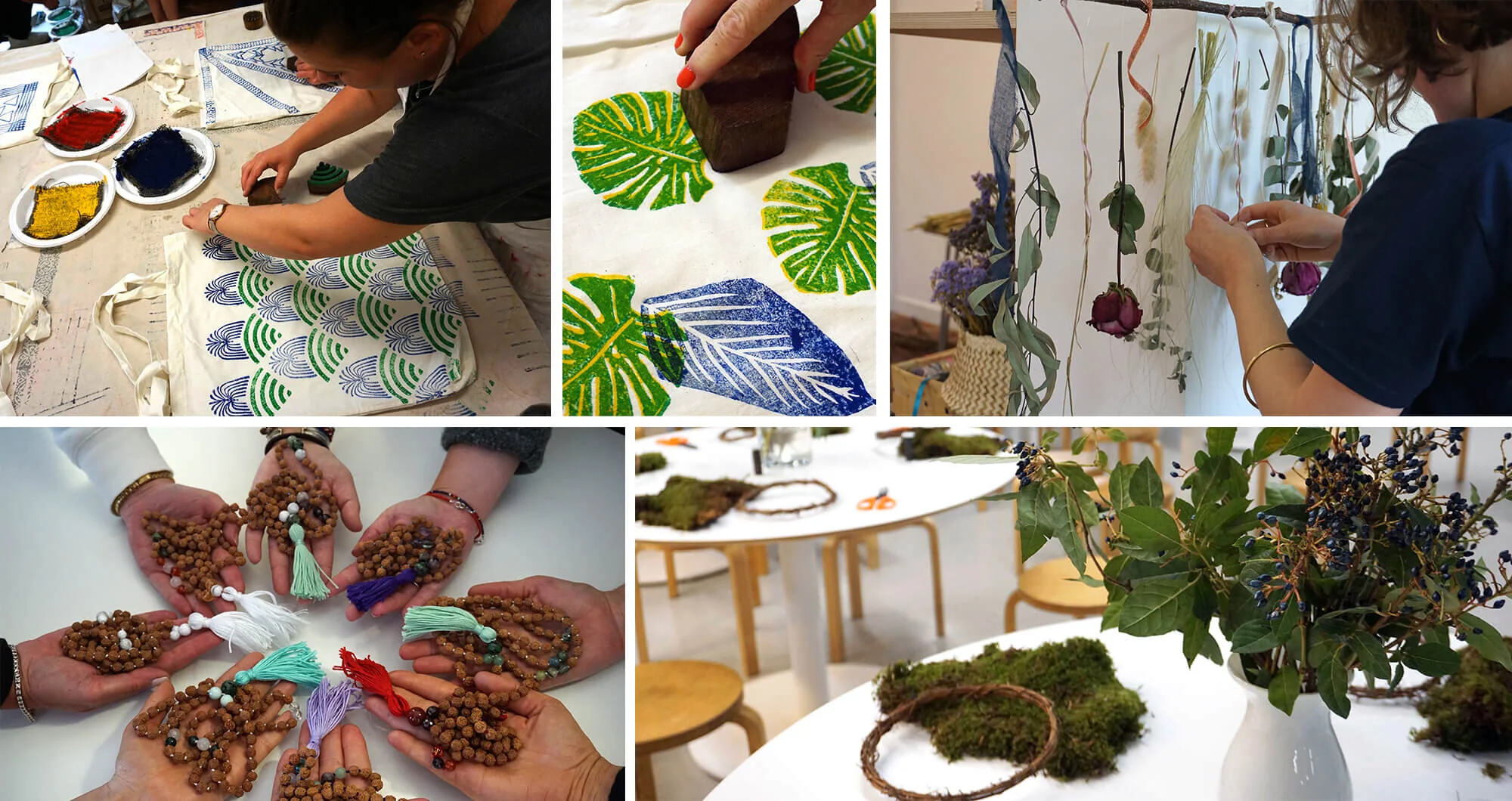 An engaging public programme of slow craft and mindful making workshops promoting mental wellbeing inviting a range of practitioners from florists to herbalists, print-makers to natural dye and textile artists. These workshops take place in community spaces, wellness centres, workplaces, and at festivals.